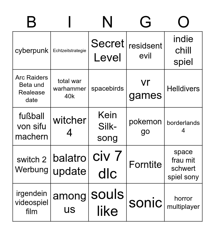 This bingo card has a free space and 24 words: balatro update, among us, spacebirds, irgendein videospiel film, indie chill spiel, cyberpunk, Arc Raiders Beta und Realease date, Echtzeitstrategie, pokemon go, civ 7 dlc, vr games, fußball von sifu machern, Forntite, space frau mit schwert spiel sony, total war warhammer 40k, sonic, borderlands 4, Secret Level, Helldivers, witcher 4, horror multiplayer, switch 2 Werbung, residsent evil and souls like.