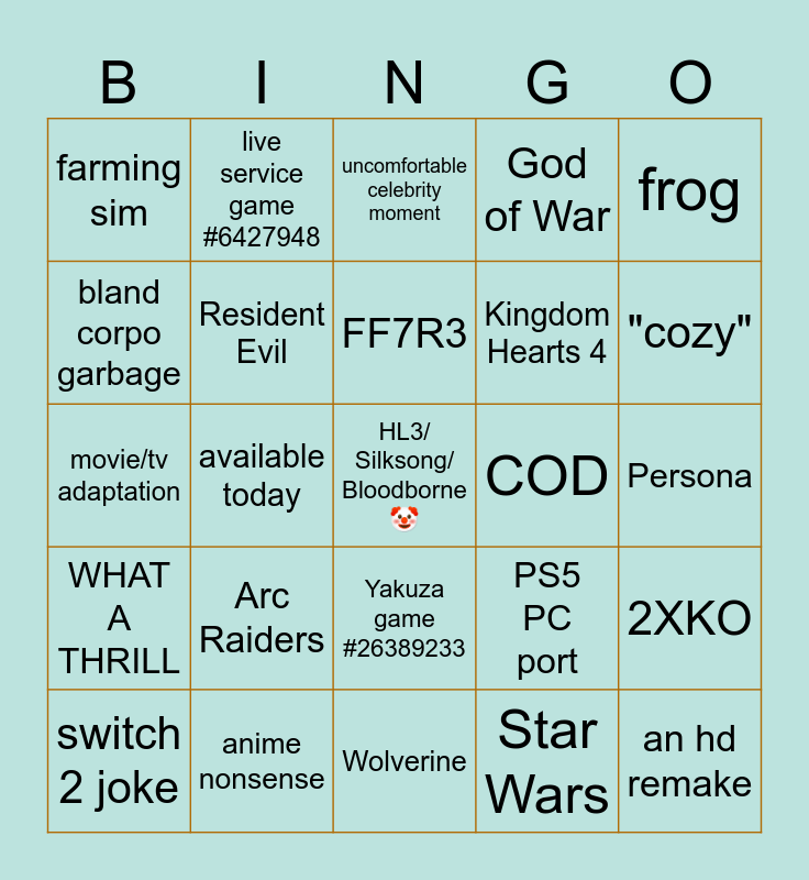This bingo card has a free space and 24 words: Arc Raiders, anime nonsense, FF7R3, switch 2 joke, frog, farming sim, bland corpo garbage, live service game #6427948, COD, Yakuza game #26389233, Kingdom Hearts 4, movie/tv adaptation, PS5 PC port, 2XKO, Resident Evil, Star Wars, Persona, uncomfortable celebrity moment, "cozy", available today, an hd remake, WHAT A THRILL, God of War and Wolverine.