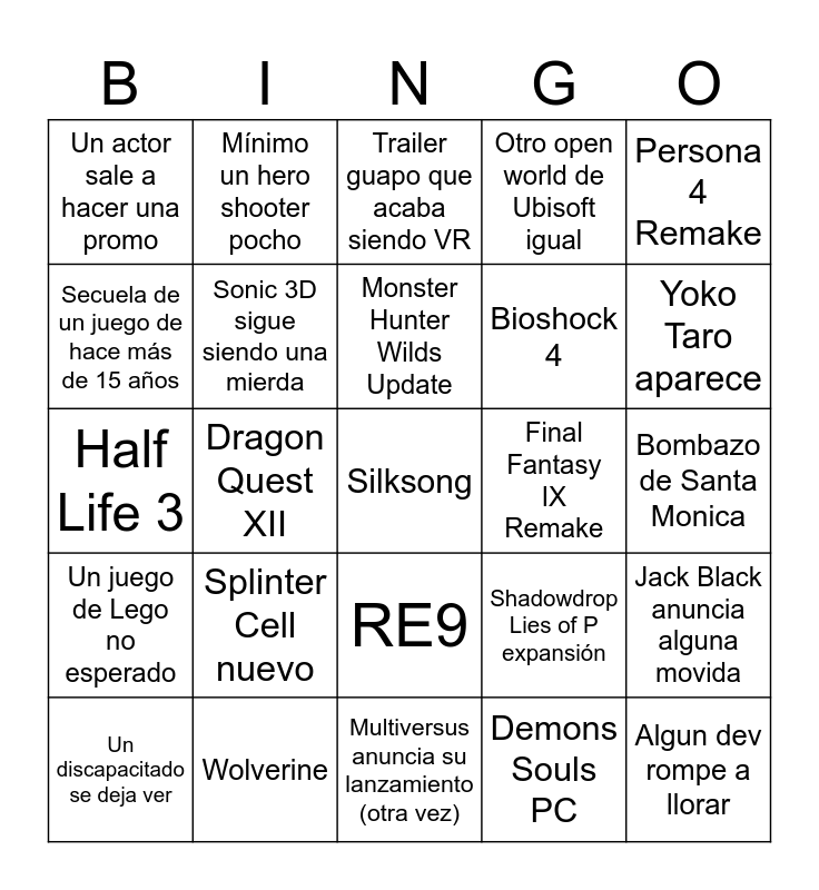 This bingo card has a free space and 24 words: Splinter Cell nuevo, Wolverine, Monster Hunter Wilds Update, Un discapacitado se deja ver, Persona 4 Remake, Un actor sale a hacer una promo, Secuela de un juego de hace más de 15 años, Mínimo un hero shooter pocho, Final Fantasy IX Remake, RE9, Bioshock 4, Half Life 3, Shadowdrop Lies of P expansión, Jack Black anuncia alguna movida, Sonic 3D sigue siendo una mierda, Demons Souls PC, Bombazo de Santa Monica, Trailer guapo que acaba siendo VR, Yoko Taro aparece, Dragon Quest XII, Algun dev rompe a llorar, Un juego de Lego no esperado, Otro open world de Ubisoft igual and Multiversus anuncia su lanzamiento (otra vez).