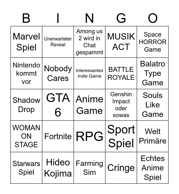This bingo card has a free space and 27 words: Sport Spiel, Expedition 33 wird erwähnt, BATTLE ROYALE, Farming Sim, Nintendo kommt vor, Among us 2 wird in Chat gespammt, Unerwarteter Reveal, WOMAN ON STAGE, Genshin Impact oder sowas, Welt Primäre, Shadow Drop, MUSIK ACT, Starwars Spiel, Hideo Kojima, Balatro Type Game, Half-Life 3, Nobody Cares, Interessantes Indie Game, Fortnite, Marvel Spiel, Souls Like Game, Cringe, GTA 6, Echtes Anime Spiel, RPG, Space HORROR Game and Neuer Character / Skin für Spiel XY.