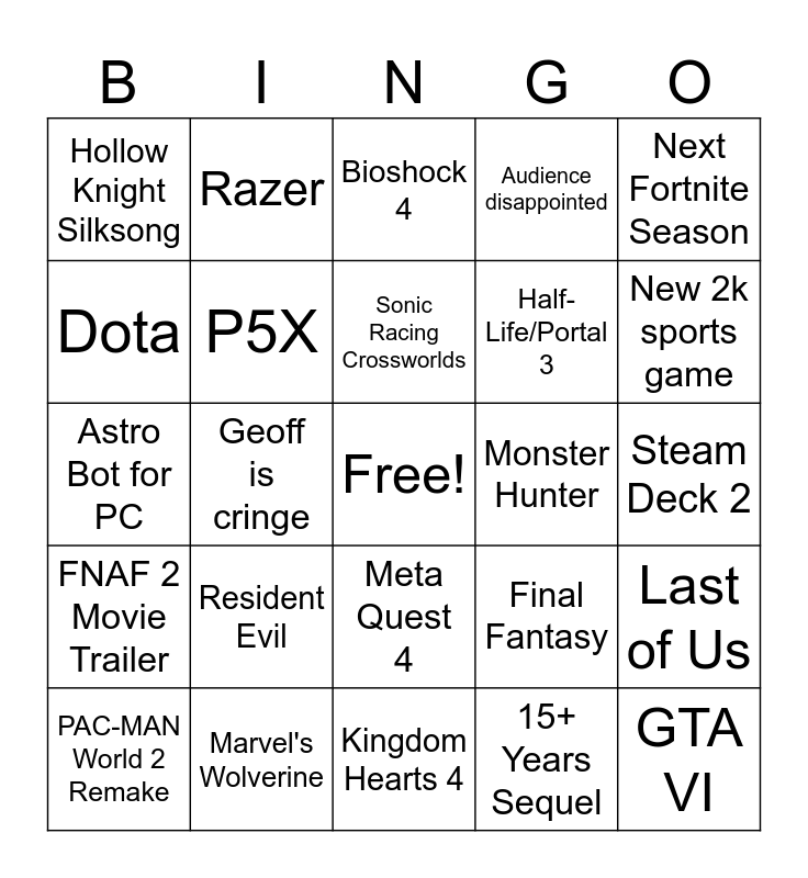 This bingo card has a free space and 24 words: Resident Evil, Marvel's Wolverine, Sonic Racing Crossworlds, PAC-MAN World 2 Remake, Next Fortnite Season, Hollow Knight Silksong, Dota, Razer, Monster Hunter, Meta Quest 4, Half-Life/Portal 3, Astro Bot for PC, Final Fantasy, Last of Us, P5X, 15+ Years Sequel, Steam Deck 2, Bioshock 4, New 2k sports game, Geoff is cringe, GTA VI, FNAF 2 Movie Trailer, Audience disappointed and Kingdom Hearts 4.
