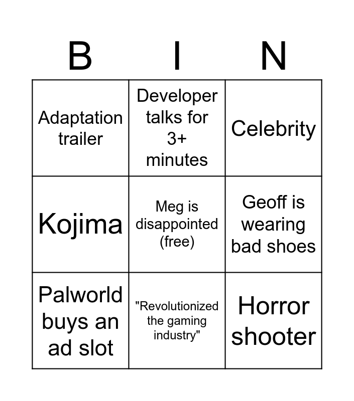 This bingo card has a free space and 8 words: Geoff is wearing bad shoes, Celebrity, Developer talks for 3+ minutes, Palworld buys an ad slot, Adaptation trailer, Horror shooter, Kojima and "Revolutionized the gaming industry".