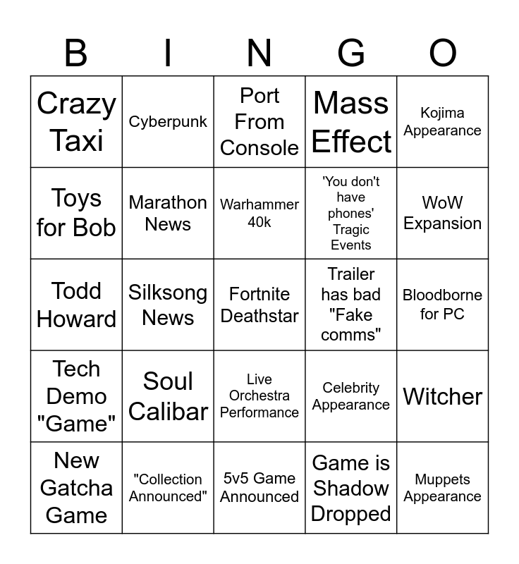 This bingo card has a free space and 29 words: New Gatcha Game, Battlefield News, Silksong News, DLC Announced, Crazy Taxi, Port From Console, Marathon News, Soul Calibar, Trailer has bad "Fake comms", "Collection Announced", Bloodborne for PC, Muppets Appearance, 5v5 Game Announced, Game is Shadow Dropped, WoW Expansion, VTuber used for Ad, Live Orchestra Performance, Tech Demo "Game", Kojima Appearance, Todd Howard, Celebrity Appearance, Totally new AAA IP, 'You don't have phones' Tragic Events, Toys for Bob, Mass Effect, Cyberpunk, Witcher, Warhammer 40k and Warhammer Fantasy.