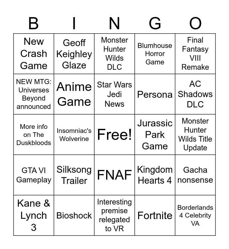 This bingo card has a free space and 24 words: Silksong Trailer, Bioshock, Star Wars Jedi News, Kane & Lynch 3, Final Fantasy VIII Remake, New Crash Game, NEW MTG: Universes Beyond announced, Geoff Keighley Glaze, Jurassic Park Game, FNAF, Persona, More info on The Duskbloods, Kingdom Hearts 4, Gacha nonsense, Anime Game, Fortnite, Monster Hunter Wilds Title Update, Monster Hunter Wilds DLC, AC Shadows DLC, Insomniac's Wolverine, Borderlands 4 Celebrity VA, GTA VI Gameplay, Blumhouse Horror Game and Interesting premise relegated to VR.