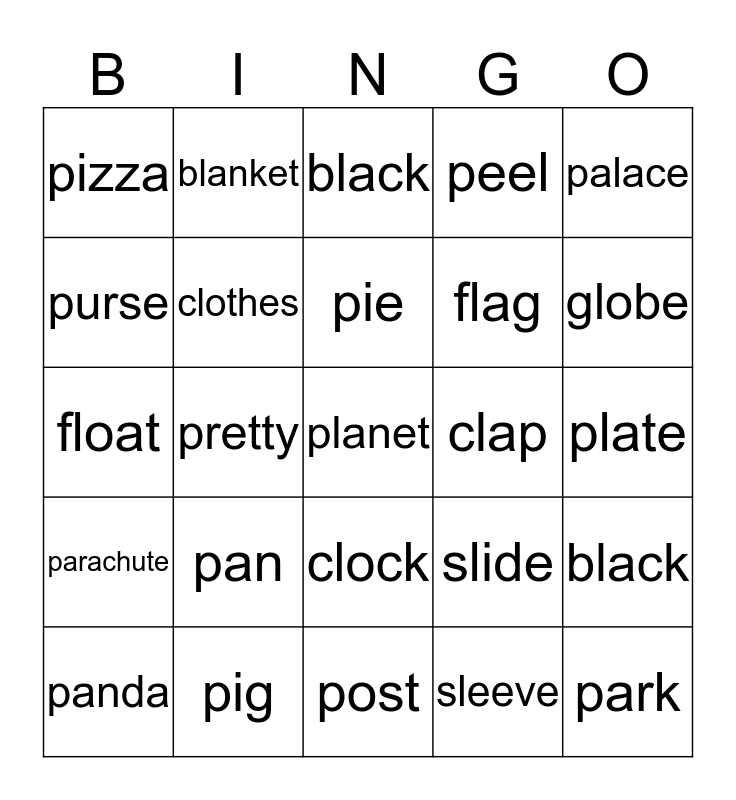 This bingo card has a free space and 24 words: pan, pig, pie, panda, palace, pizza, purse, blanket, clap, clock, flag, float, slide, black, clothes, sleeve, plate, black, globe, pretty, park, parachute, peel and post.