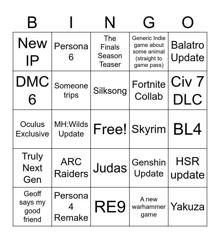 This bingo card has a free space and 24 words: ARC Raiders, Persona 4 Remake, Silksong, Geoff says my good friend, Balatro Update, New IP, DMC 6, Persona 6, Skyrim, Judas, Fortnite Collab, Oculus Exclusive, Genshin Update, HSR update, Someone trips, A new warhammer game, BL4, The Finals Season Teaser, Civ 7 DLC, MH:Wilds Update, Yakuza, Truly Next Gen, Generic Indie game about some animal (straight to game pass) and RE9.