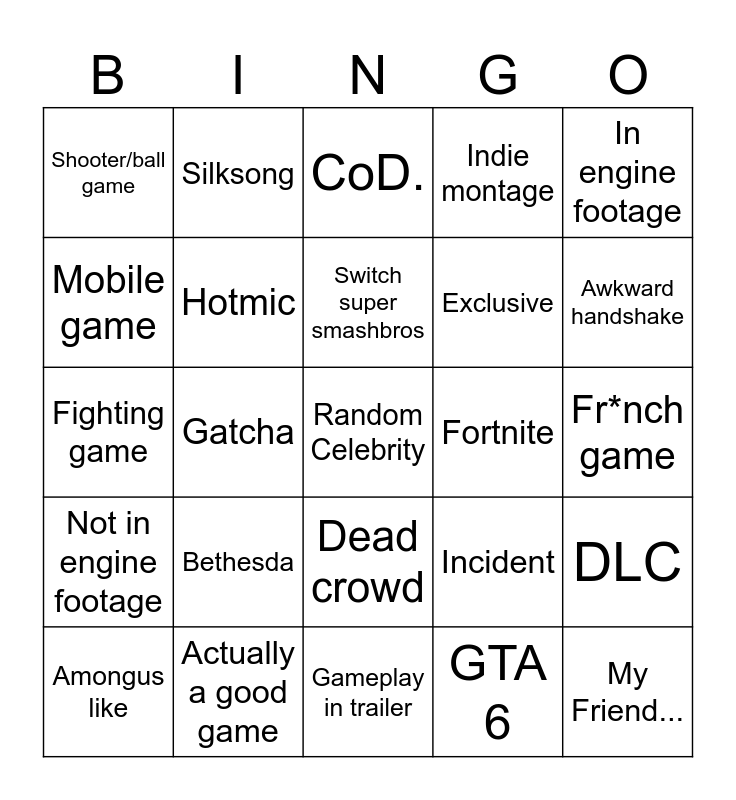 This bingo card has a free space and 24 words: Bethesda, Actually a good game, Switch super smashbros, Amongus like, In engine footage, Shooter/ball game, Mobile game, Silksong, Fortnite, Dead crowd, Exclusive, Fighting game, Incident, DLC, Hotmic, GTA 6, Fr*nch game, CoD., Awkward handshake, Gatcha, My Friend..., Not in engine footage, Indie montage and Gameplay in trailer.