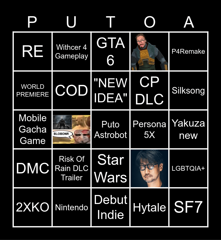 This bingo card has 3 images and 22 words: Risk Of Rain DLC Trailer, Debut Indie, "NEW IDEA", 2XKO, P4Remake, RE, WORLD PREMIERE, Withcer 4 Gameplay, Persona 5X, Star Wars, CP DLC, Mobile Gacha Game, LGBTQIA+, COD, SF7, Yakuza new, GTA 6, Silksong, Puto Astrobot, Nintendo, DMC and Hytale.