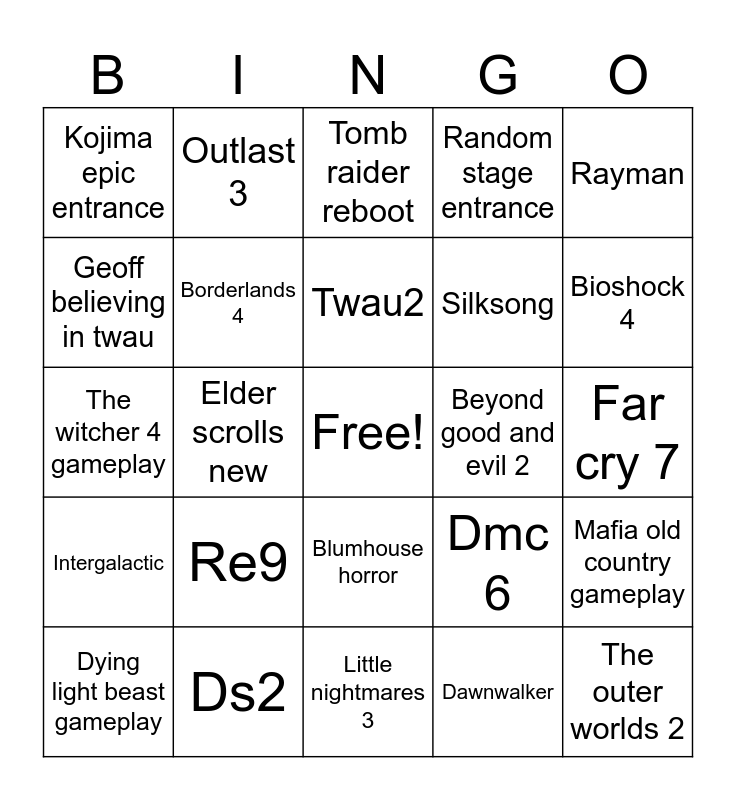 This bingo card has a free space and 24 words: Re9, Ds2, Twau2, Dying light beast gameplay, Rayman, Kojima epic entrance, Geoff believing in twau, Outlast 3, Beyond good and evil 2, Blumhouse horror, Silksong, The witcher 4 gameplay, Dmc 6, Mafia old country gameplay, Borderlands 4, Dawnwalker, Far cry 7, Tomb raider reboot, Bioshock 4, Elder scrolls new, The outer worlds 2, Intergalactic, Random stage entrance and Little nightmares 3.