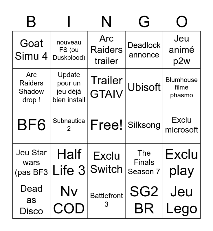 This bingo card has a free space and 24 words: Half Life 3, Nv COD, Trailer GTAIV, Dead as Disco, Jeu animé p2w, Goat Simu 4, Arc Raiders Shadow drop !, nouveau FS (ou Duskblood), Silksong, Exclu Switch, Ubisoft, BF6, The Finals Season 7, Exclu play, Update pour un jeu déjà bien install, SG2 BR, Exclu microsoft, Arc Raiders trailer, Blumhouse filme phasmo, Subnautica 2, Jeu Lego, Jeu Star wars (pas BF3, Deadlock annonce and Battlefront 3.