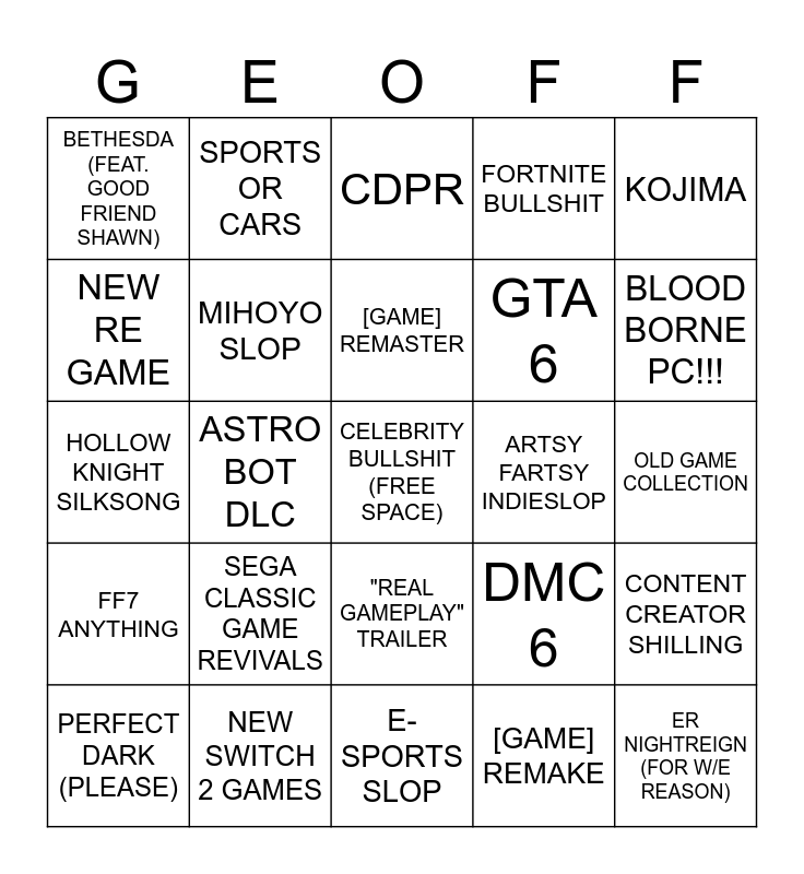 This bingo card has a free space and 24 words: SEGA CLASSIC GAME REVIVALS, NEW SWITCH 2 GAMES, [GAME] REMASTER, PERFECT DARK (PLEASE), KOJIMA, BETHESDA (FEAT. GOOD FRIEND SHAWN), NEW RE GAME, SPORTS OR CARS, ARTSY FARTSY INDIESLOP, "REAL GAMEPLAY" TRAILER, GTA 6, HOLLOW KNIGHT SILKSONG, DMC 6, CONTENT CREATOR SHILLING, MIHOYO SLOP, [GAME] REMAKE, OLD GAME COLLECTION, CDPR, BLOOD BORNE PC!!!, ASTRO BOT DLC, ER NIGHTREIGN (FOR W/E REASON), FF7 ANYTHING, FORTNITE BULLSHIT and E-SPORTS SLOP.