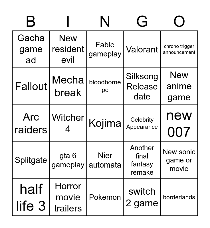 This bingo card has a free space and 24 words: half life 3, gta 6 gameplay, bloodborne pc, switch 2 game, chrono trigger announcement, Gacha game ad, New resident evil, Fable gameplay, Celebrity Appearance, new 007, Arc raiders, Mecha break, Another final fantasy remake, New sonic game or movie, Fallout, Horror movie trailers, Pokemon, Valorant, New anime game, Splitgate, Witcher 4, Nier automata, Silksong Release date and borderlands.