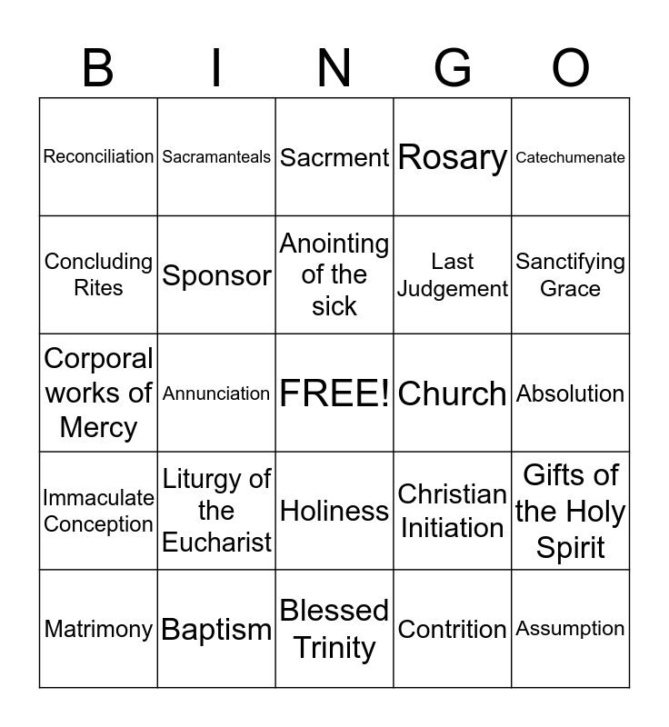 This bingo card has a free space and 24 words: Liturgy of the Eucharist, Baptism, Anointing of the sick, Matrimony, Catechumenate, Reconciliation, Concluding Rites, Sacramanteals, Church, Holiness, Last Judgement, Corporal works of Mercy, Christian Initiation, Gifts of the Holy Spirit, Sponsor, Contrition, Absolution, Sacrment, Sanctifying Grace, Annunciation, Assumption, Immaculate Conception, Rosary and Blessed Trinity.