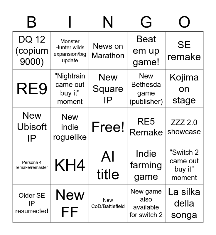 This bingo card has a free space and 24 words: KH4, New FF, New Square IP, Older SE IP resurrected, SE remake, DQ 12 (copium 9000), RE9, Monster Hunter wilds expansion/big update, RE5 Remake, AI title, New Bethesda game (publisher), New Ubisoft IP, Indie farming game, "Switch 2 came out buy it" moment, "Nightrain came out buy it" moment, New game also available for switch 2, ZZZ 2.0 showcase, News on Marathon, Kojima on stage, New indie roguelike, La silka della songa, Persona 4 remake/remaster, Beat em up game! and New CoD/Battlefield.