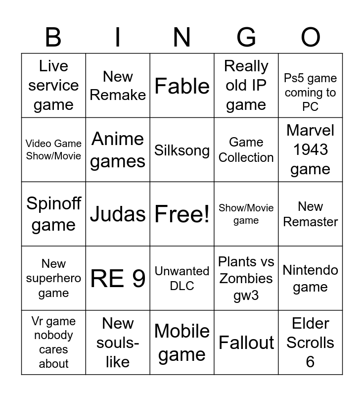 This bingo card has a free space and 24 words: RE 9, New souls-like, Silksong, Vr game nobody cares about, Ps5 game coming to PC, Live service game, Video Game Show/Movie, New Remake, Show/Movie game, Unwanted DLC, Game Collection, Spinoff game, Plants vs Zombies gw3, Nintendo game, Anime games, Fallout, New Remaster, Fable, Marvel 1943 game, Judas, Elder Scrolls 6, New superhero game, Really old IP game and Mobile game.