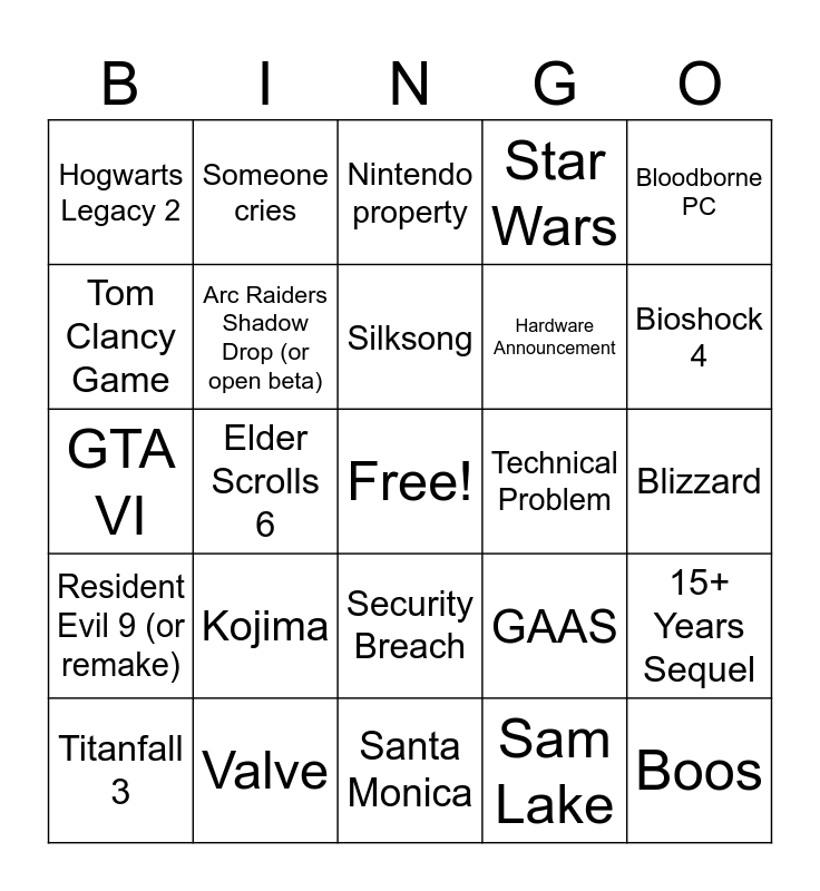 This bingo card has a free space and 24 words: Kojima, Valve, Silksong, Titanfall 3, Bloodborne PC, Hogwarts Legacy 2, Tom Clancy Game, Someone cries, Technical Problem, Security Breach, Hardware Announcement, GTA VI, GAAS, 15+ Years Sequel, Arc Raiders Shadow Drop (or open beta), Sam Lake, Blizzard, Nintendo property, Bioshock 4, Elder Scrolls 6, Boos, Resident Evil 9 (or remake), Star Wars and Santa Monica.