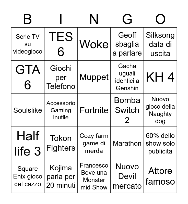 This bingo card has a free space and 24 words: Tokon Fighters, Kojima parla per 20 minuti, Muppet, Square Enix gioco del cazzo, Silksong data di uscita, Serie TV su videogioco, GTA 6, TES 6, Bomba Switch 2, Cozy farm game di merda, Gacha uguali identici a Genshin, Soulslike, Marathon, 60% dello show solo publicita, Giochi per Telefono, Nuovo Devil mercato, Nuovo gioco della Naughty dog, Woke, KH 4, Accessorio Gaming inutile, Attore famoso, Half life 3, Geoff sbaglia a parlare and Francesco Beve una Monster mid Show.