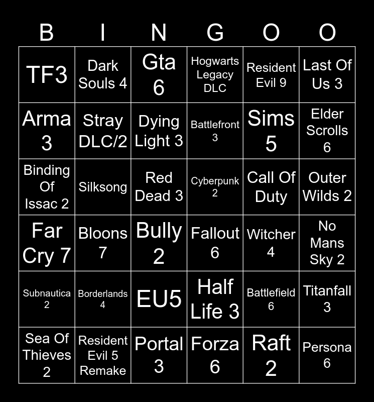 This bingo card has 36 words: Half Life 3, EU5, Forza 6, Arma 3, Far Cry 7, Cyberpunk 2, Stray DLC/2, Portal 3, Resident Evil 9, Battlefield 6, Elder Scrolls 6, Hogwarts Legacy DLC, Titanfall 3, Silksong, Battlefront 3, TF3, Subnautica 2, Call Of Duty, Binding Of Issac 2, Gta 6, Red Dead 3, Bloons 7, Fallout 6, Bully 2, Witcher 4, Dark Souls 4, Sims 5, Resident Evil 5 Remake, Dying Light 3, Last Of Us 3, Persona 6, Sea Of Thieves 2, No Mans Sky 2, Outer Wilds 2, Borderlands 4 and Raft 2.