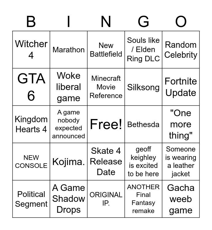 This bingo card has a free space and 24 words: Kojima., A Game Shadow Drops, Minecraft Movie Reference, Political Segment, Random Celebrity, Witcher 4, GTA 6, Marathon, Bethesda, Skate 4 Release Date, Silksong, Kingdom Hearts 4, geoff keighley is excited to be here, Someone is wearing a leather jacket, Woke liberal game, ANOTHER Final Fantasy remake, "One more thing", New Battlefield, Fortnite Update, A game nobody expected announced, Gacha weeb game, NEW CONSOLE, Souls like / Elden Ring DLC and ORIGINAL IP..