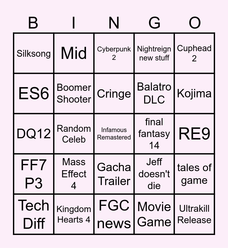 This bingo card has 25 words: Mass Effect 4, FGC news, Cringe, Tech Diff, Cuphead 2, Silksong, ES6, Mid, final fantasy 14, Gacha Trailer, Balatro DLC, DQ12, Jeff doesn't die, tales of game, Boomer Shooter, Ultrakill Release, RE9, Cyberpunk 2, Kojima, Random Celeb, Infamous Remastered, Kingdom Hearts 4, FF7 P3, Nightreign new stuff and Movie Game.