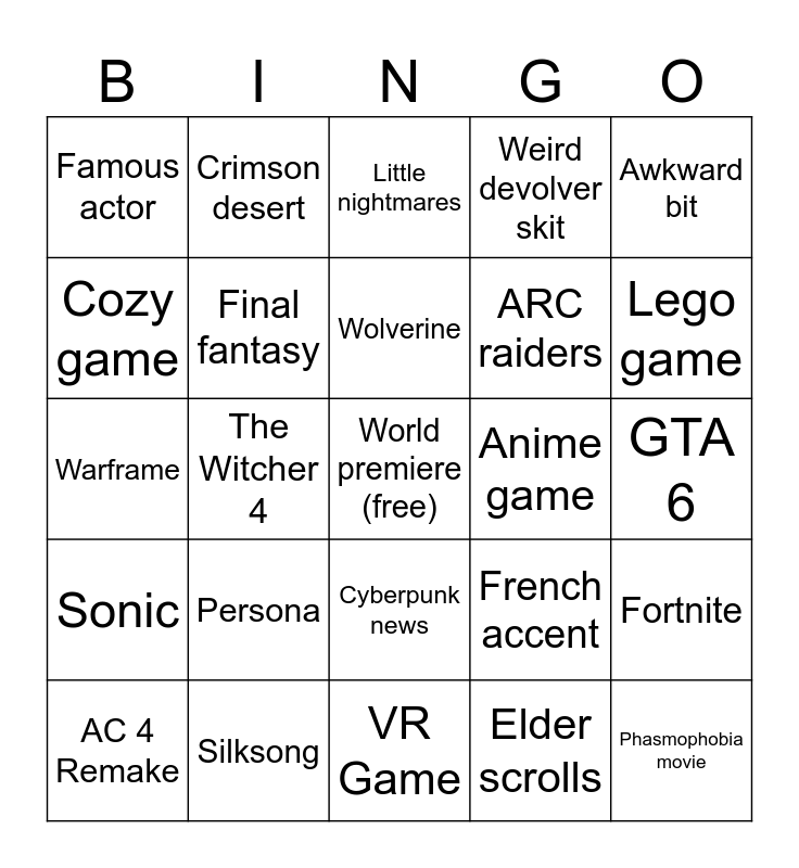 This bingo card has a free space and 24 words: Persona, Silksong, Wolverine, AC 4 Remake, Awkward bit, Famous actor, Cozy game, Crimson desert, Anime game, Cyberpunk news, ARC raiders, Warframe, French accent, Fortnite, Final fantasy, Elder scrolls, GTA 6, Little nightmares, Lego game, The Witcher 4, Phasmophobia movie, Sonic, Weird devolver skit and VR Game.