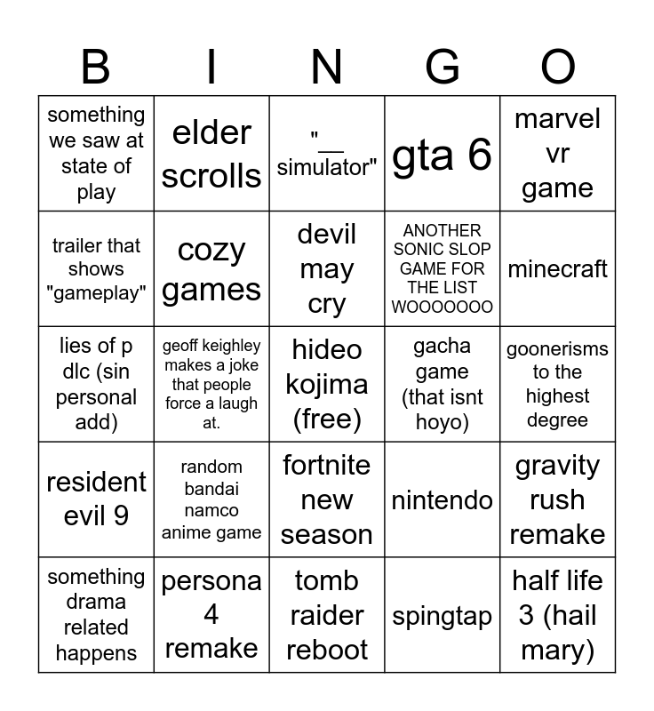 This bingo card has a free space and 29 words: something drama related happens, sequel no one wanted, geoff keighley makes a joke that people force a laugh at., silksong, something we saw at state of play, "__ simulator", cozy games, random bandai namco anime game, gacha game (that isnt hoyo), persona 4 remake, goonerisms to the highest degree, half life 3 (hail mary), tomb raider reboot, spingtap, minecraft, death stranding 2, fortnite new season, resident evil 9, marvel vr game, lies of p dlc (sin personal add), nintendo, new supermassive game, ANOTHER SONIC SLOP GAME FOR THE LIST WOOOOOOO, trailer that shows "gameplay", gta 6, elder scrolls, gravity rush remake, devil may cry and sin starts crying.