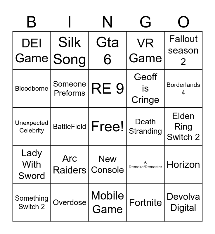 This bingo card has a free space and 24 words: Arc Raiders, Overdose, RE 9, Something Switch 2, Fallout season 2, DEI Game, Bloodborne, Silk Song, Death Stranding, New Console, Geoff is Cringe, Unexpected Celebrity, A Remake/Remaster, Horizon, Someone Preforms, Fortnite, Elden Ring Switch 2, Gta 6, Borderlands 4, BattleField, Devolva Digital, Lady With Sword, VR Game and Mobile Game.
