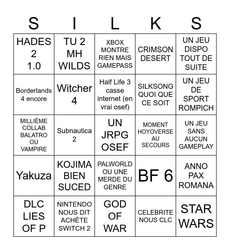 This bingo card has a free space and 24 words: KOJIMA BIEN SUCED, NINTENDO NOUS DIT ACHÈTE SWITCH 2, Half Life 3 casse internet (en vrai osef), DLC LIES OF P, UN JEU DISPO TOUT DE SUITE, HADES 2 1.0, Borderlands 4 encore, TU 2 MH WILDS, MOMENT HOYOVERSE AU SECOURS, PALWORLD OU UNE MERDE DU GENRE, SILKSONG QUOI QUE CE SOIT, MILLIÈME COLLAB BALATRO OU VAMPIRE, BF 6, ANNO PAX ROMANA, Witcher 4, CELEBRITE NOUS CLC, UN JEU SANS AUCUN GAMEPLAY, XBOX MONTRE RIEN MAIS GAMEPASS, UN JEU DE SPORT ROMPICH, Subnautica 2, STAR WARS, Yakuza, CRIMSON DESERT and GOD OF WAR.