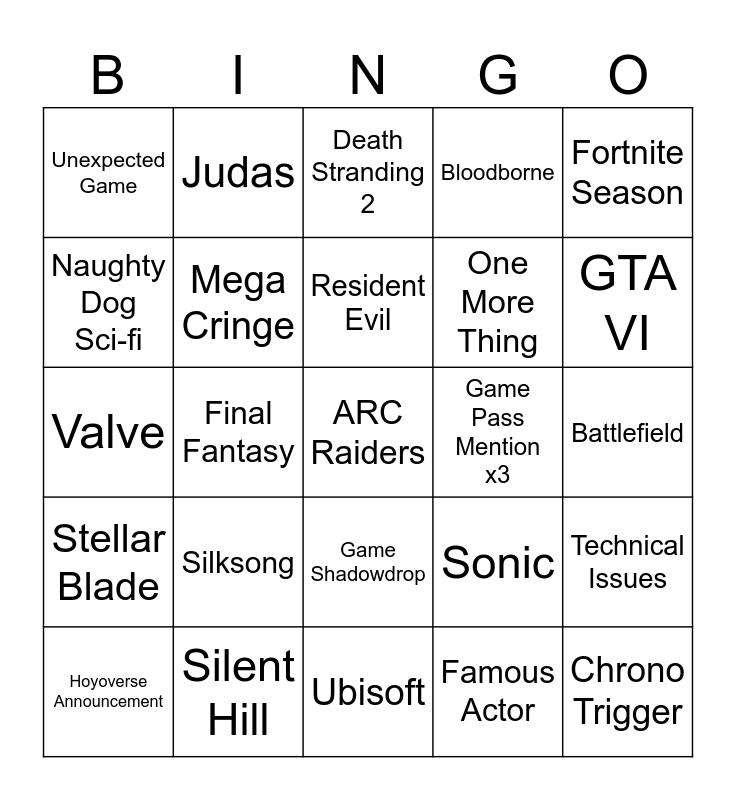 This bingo card has a free space and 24 words: Silksong, Silent Hill, Resident Evil, Hoyoverse Announcement, Fortnite Season, Unexpected Game, Naughty Dog Sci-fi, Judas, Game Pass Mention x3, Game Shadowdrop, One More Thing, Valve, Sonic, Technical Issues, Mega Cringe, Famous Actor, Battlefield, Death Stranding 2, GTA VI, Final Fantasy, Chrono Trigger, Stellar Blade, Bloodborne and Ubisoft.