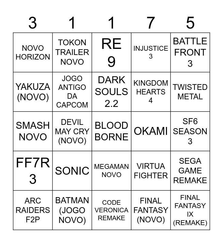 This bingo card has a free space and 24 words: ARC RAIDERS F2P, SONIC, DARK SOULS 2.2, FINAL FANTASY (NOVO), BATTLE FRONT 3, NOVO HORIZON, TOKON TRAILER NOVO, RE 9, OKAMI, SF6 SEASON 3, SMASH NOVO, JOGO ANTIGO DA CAPCOM, VIRTUA FIGHTER, SEGA GAME REMAKE, YAKUZA (NOVO), BATMAN (JOGO NOVO), CODE VERONICA REMAKE, INJUSTICE 3, TWISTED METAL, FF7R 3, DEVIL MAY CRY (NOVO), MEGAMAN NOVO, KINGDOM HEARTS 4 and FINAL FANTASY IX (REMAKE).