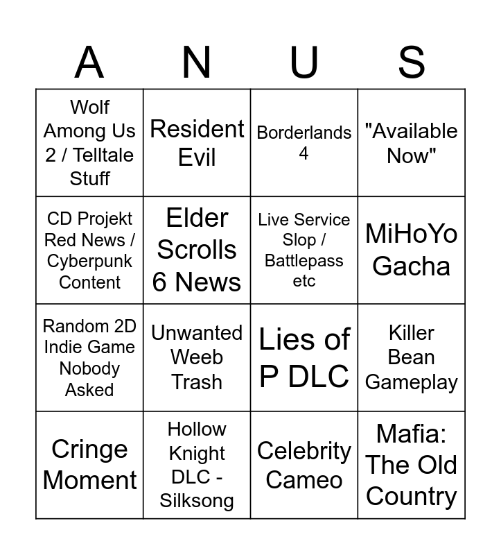 This bingo card has 16 words: Hollow Knight DLC - Silksong, Killer Bean Gameplay, Borderlands 4, Wolf Among Us 2 / Telltale Stuff, Random 2D Indie Game Nobody Asked, Resident Evil, Lies of P DLC, Celebrity Cameo, CD Projekt Red News / Cyberpunk Content, Elder Scrolls 6 News, Cringe Moment, "Available Now", Unwanted Weeb Trash, MiHoYo Gacha, Live Service Slop / Battlepass etc and Mafia: The Old Country.