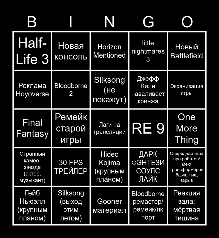 This bingo card has a free space and 24 words: 30 FPS ТРЕЙЛЕР, Silksong (выход этим летом), Silksong (не покажут), Гейб Ньюэлл (крупным планом), Новый Battlefield, Half-Life 3, Реклама Hoyoverse, Новая консоль, RE 9, Hideo Kojima (крупным планом), Джефф Кили наваливает кринжа, Final Fantasy, ДАРК ФЭНТЕЗИ СОУЛС ЛАЙК, Очередная игра про роботов/мех/трансформеров бдыщ тыщ взрыв, Bloodborne 2, Bloodborne ремастер/ремейк/пк порт, One More Thing, Horizon Mentioned, Экранизация игры, Ремейк старой игры, Реакция зала: мёртвая тишина, Странный камео- звезда (актер, музыкант), little nightmares 3 and Gooner материал.