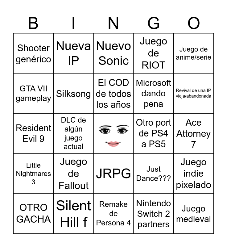 This bingo card has a free space and 24 words: Juego de Fallout, Silent Hill f, El COD de todos los años, OTRO GACHA, Juego de anime/serie, Shooter genérico, GTA VII gameplay, Nueva IP, Otro port de PS4 a PS5, JRPG, Microsoft dando pena, Resident Evil 9, Just Dance???, Juego indie pixelado, Silksong, Nintendo Switch 2 partners, Ace Attorney 7, Nuevo Sonic, Revival de una IP vieja/abandonada, DLC de algún juego actual, Juego medieval, Little Nightmares 3, Juego de RIOT and Remake de Persona 4.