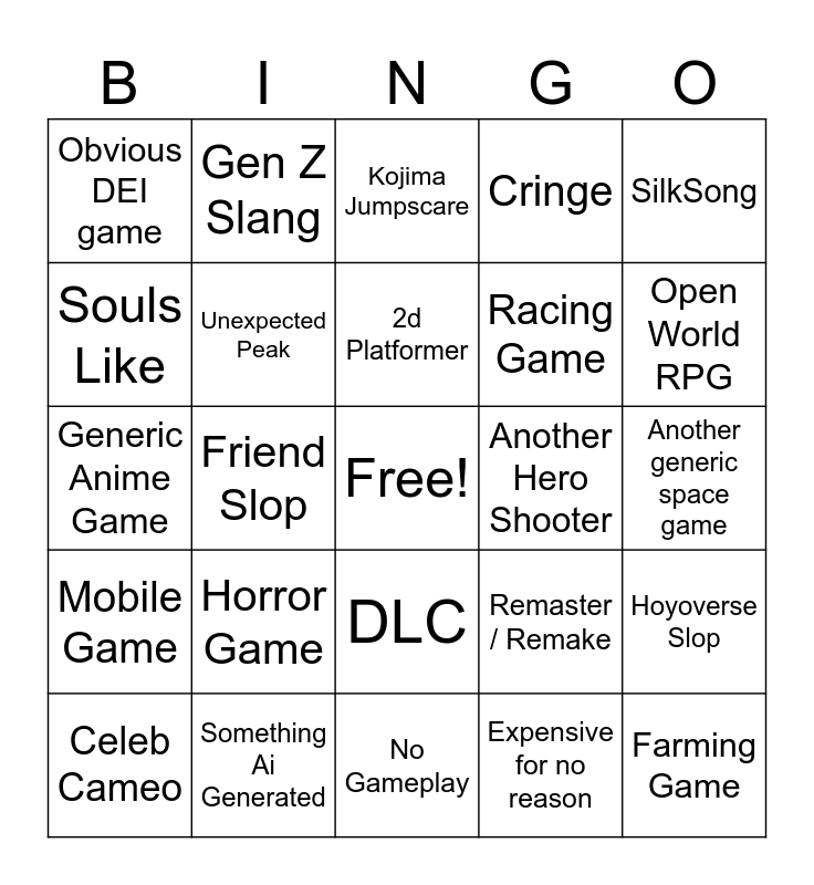 This bingo card has a free space and 24 words: Horror Game, Something Ai Generated, 2d Platformer, Celeb Cameo, SilkSong, Obvious DEI game, Souls Like, Gen Z Slang, Another Hero Shooter, DLC, Racing Game, Generic Anime Game, Remaster / Remake, Hoyoverse Slop, Unexpected Peak, Expensive for no reason, Another generic space game, Kojima Jumpscare, Open World RPG, Friend Slop, Farming Game, Mobile Game, Cringe and No Gameplay.