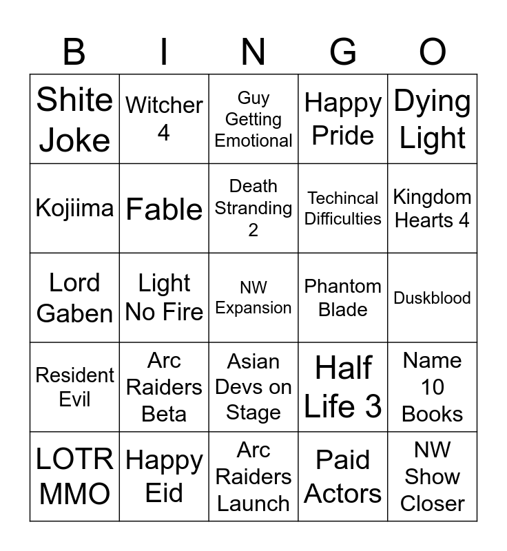 This bingo card has a free space and 24 words: Arc Raiders Beta, Happy Eid, Death Stranding 2, LOTR MMO, Dying Light, Shite Joke, Kojiima, Witcher 4, Phantom Blade, Asian Devs on Stage, Techincal Difficulties, Lord Gaben, Half Life 3, Name 10 Books, Fable, Paid Actors, Duskblood, Guy Getting Emotional, Kingdom Hearts 4, Light No Fire, NW Show Closer, Resident Evil, Happy Pride and Arc Raiders Launch.