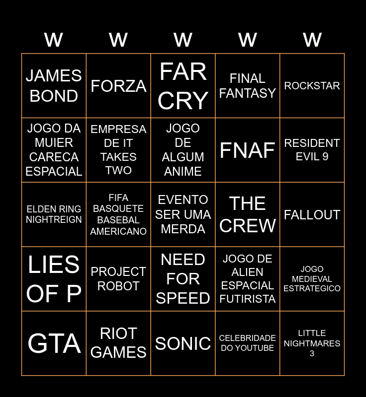 This bingo card has a free space and 24 words: PROJECT ROBOT, RIOT GAMES, JOGO DE ALGUM ANIME, GTA, ROCKSTAR, JAMES BOND, JOGO DA MUIER CARECA ESPACIAL, FORZA, THE CREW, NEED FOR SPEED, FNAF, ELDEN RING NIGHTREIGN, JOGO DE ALIEN ESPACIAL FUTIRISTA, JOGO MEDIEVAL ESTRATEGICO, EMPRESA DE IT TAKES TWO, CELEBRIDADE DO YOUTUBE, FALLOUT, FAR CRY, RESIDENT EVIL 9, FIFA BASQUETE BASEBAL AMERICANO, LITTLE NIGHTMARES 3, LIES OF P, FINAL FANTASY and SONIC.