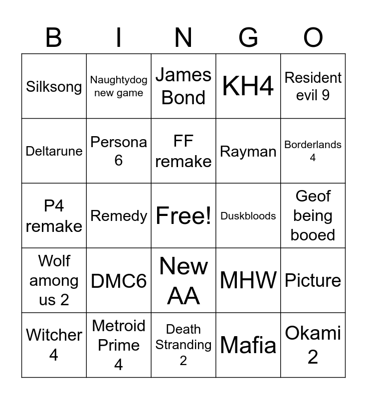 This bingo card has a free space and 24 words: DMC6, Metroid Prime 4, FF remake, Witcher 4, Resident evil 9, Silksong, Deltarune, Naughtydog new game, Duskbloods, New AA, Rayman, P4 remake, MHW, Picture, Persona 6, Mafia, Geof being booed, James Bond, Borderlands 4, Remedy, Okami 2, Wolf among us 2, KH4 and Death Stranding 2.