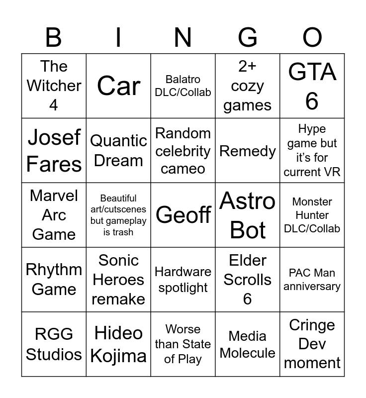 This bingo card has a free space and 24 words: Sonic Heroes remake, Hideo Kojima, Random celebrity cameo, RGG Studios, GTA 6, The Witcher 4, Josef Fares, Car, Astro Bot, Hardware spotlight, Remedy, Marvel Arc Game, Elder Scrolls 6, PAC Man anniversary, Quantic Dream, Media Molecule, Monster Hunter DLC/Collab, Balatro DLC/Collab, Hype game but it’s for current VR, Beautiful art/cutscenes but gameplay is trash, Cringe Dev moment, Rhythm Game, 2+ cozy games and Worse than State of Play.