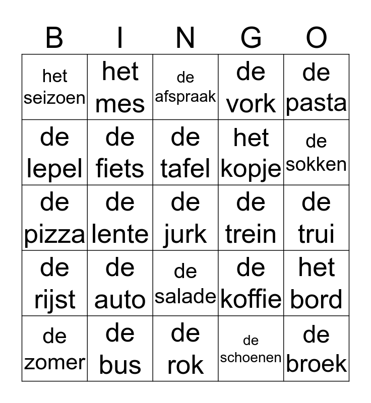 This bingo card has a free space and 29 words: de zomer, de winter, de lente, de herfst, het seizoen, de afspraak, de fiets, de auto, de trein, de bus, de trui, de broek, de rok, de schoenen, de sokken, het brood, de salade, de rijst, de pasta, de pizza, de koffie, de thee, het kopje, de lepel, de vork, het mes, het bord, de tafel and de keuken.