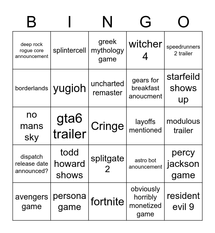 This bingo card has a free space and 68 words: mobious anouncment, resident evil 9, elder scrolls 6 trailer, enter gungeon 2, Balatro update trailer, gacha mobile game, splintercell, SilkSong trailer, uncharted remaster, donkey kong trailer, splitgate 2, assasins creed, modulous trailer, speedrunners 2 trailer, elon shows up, borderlands, gta6 trailer, deep rock rogue core announcement, cozy farming sim thats also an rpg trailer, todd howard shows, gears for breakfast anoucment, astro bot anouncement, dispatch release date announced?, deltarune thingy, minecraft mentioned, co-op arena fps, banjo kazooie, lego game announcment, percy jackson game, harry potter game, greek mythology game, musical genre game, Rhythm game, new batman game, witcher 4, witcher 1 remaster, nintendo doesnt announce anything, avengers game, starfeild shows up, no mans sky, death stranding 2, any valve game, yugioh, roblox, metaverse word gets used, ai (LLM) is mentioned, diablo game, POE2, layoffs mentioned, persona game, horizon game, among us update, forza, fortnite, lora croft, EA Game, obviously horribly monetized game, red bull, palworld, schedule 1, REPO, pacman, video game tv adaptation, battlefeild, concord 2, rayman, lies of p and Ubisoft.