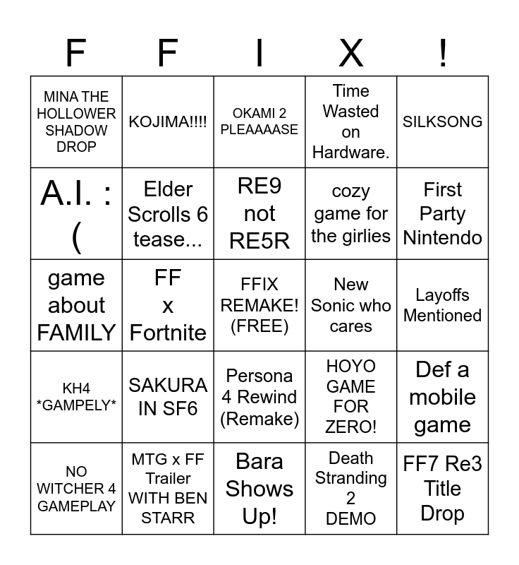 This bingo card has a free space and 24 words: SAKURA IN SF6, MTG x FF Trailer WITH BEN STARR, RE9 not RE5R, NO WITCHER 4 GAMEPLAY, SILKSONG, MINA THE HOLLOWER SHADOW DROP, A.I. :(, KOJIMA!!!!, New Sonic who cares, Persona 4 Rewind (Remake), cozy game for the girlies, game about FAMILY, HOYO GAME FOR ZERO!, Def a mobile game, Elder Scrolls 6 tease..., Death Stranding 2 DEMO, Layoffs Mentioned, OKAMI 2 PLEAAAASE, First Party Nintendo, FF x Fortnite, FF7 Re3 Title Drop, KH4 *GAMPELY*, Time Wasted on Hardware. and Bara Shows Up!.