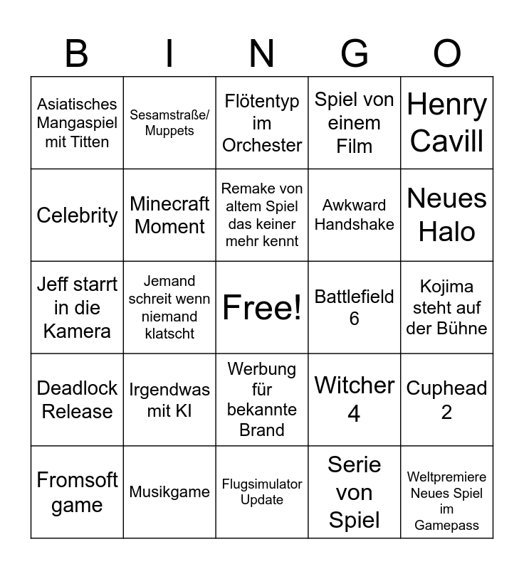 This bingo card has a free space and 24 words: Irgendwas mit KI, Musikgame, Remake von altem Spiel das keiner mehr kennt, Fromsoft game, Henry Cavill, Asiatisches Mangaspiel mit Titten, Celebrity, Sesamstraße/ Muppets, Battlefield 6, Werbung für bekannte Brand, Awkward Handshake, Jeff starrt in die Kamera, Witcher 4, Cuphead 2, Minecraft Moment, Serie von Spiel, Kojima steht auf der Bühne, Flötentyp im Orchester, Neues Halo, Jemand schreit wenn niemand klatscht, Weltpremiere Neues Spiel im Gamepass, Deadlock Release, Spiel von einem Film and Flugsimulator Update.
