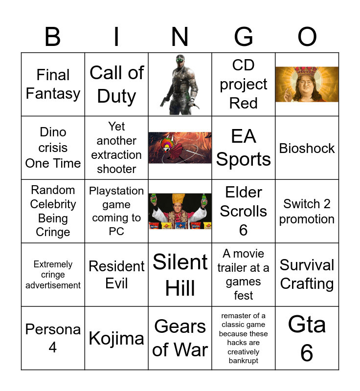 This bingo card has 3 images, a free space and 21 words: Resident Evil, Kojima, Persona 4, Final Fantasy, Dino crisis One Time, Call of Duty, Elder Scrolls 6, Silent Hill, EA Sports, Random Celebrity Being Cringe, A movie trailer at a games fest, Survival Crafting, Yet another extraction shooter, remaster of a classic game because these hacks are creatively bankrupt, Switch 2 promotion, Bioshock, Playstation game coming to PC, Gta 6, Extremely cringe advertisement, CD project Red and Gears of War.