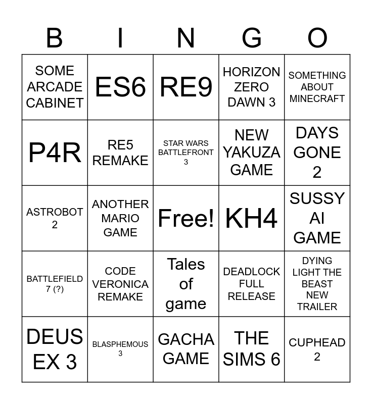 This bingo card has a free space and 24 words: CODE VERONICA REMAKE, BLASPHEMOUS 3, STAR WARS BATTLEFRONT 3, DEUS EX 3, SOMETHING ABOUT MINECRAFT, SOME ARCADE CABINET, P4R, ES6, KH4, Tales of game, NEW YAKUZA GAME, ASTROBOT 2, DEADLOCK FULL RELEASE, DYING LIGHT THE BEAST NEW TRAILER, RE5 REMAKE, THE SIMS 6, SUSSY AI GAME, RE9, DAYS GONE 2, ANOTHER MARIO GAME, CUPHEAD 2, BATTLEFIELD 7 (?), HORIZON ZERO DAWN 3 and GACHA GAME.