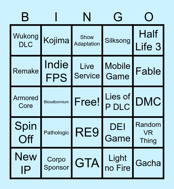 This bingo card has a free space and 24 words: Pathologic, Corpo Sponsor, Live Service, New IP, Half Life 3, Wukong DLC, Remake, Kojima, Lies of P DLC, RE9, Mobile Game, Armored Core, DEI Game, Random VR Thing, Indie FPS, Light no Fire, DMC, Show Adaptation, Fable, Bloodbornium, Gacha, Spin Off, Silksong and GTA.