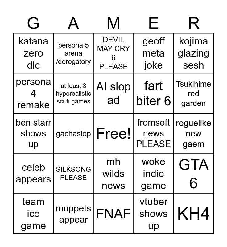 This bingo card has a free space and 24 words: SILKSONG PLEASE, muppets appear, AI slop ad, team ico game, kojima glazing sesh, katana zero dlc, persona 4 remake, persona 5 arena /derogatory, fromsoft news PLEASE, mh wilds news, fart biter 6, ben starr shows up, woke indie game, GTA 6, at least 3 hyperealistic sci-fi games, vtuber shows up, roguelike new gaem, DEVIL MAY CRY 6 PLEASE, Tsukihime red garden, gachaslop, KH4, celeb appears, geoff meta joke and FNAF.