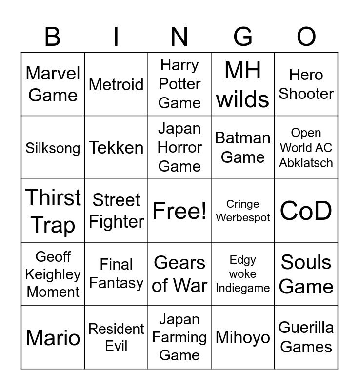This bingo card has a free space and 24 words: Final Fantasy, Resident Evil, Japan Horror Game, Mario, Hero Shooter, Marvel Game, Silksong, Metroid, Cringe Werbespot, Gears of War, Batman Game, Thirst Trap, Edgy woke Indiegame, Souls Game, Tekken, Mihoyo, CoD, Harry Potter Game, Open World AC Abklatsch, Street Fighter, Guerilla Games, Geoff Keighley Moment, MH wilds and Japan Farming Game.