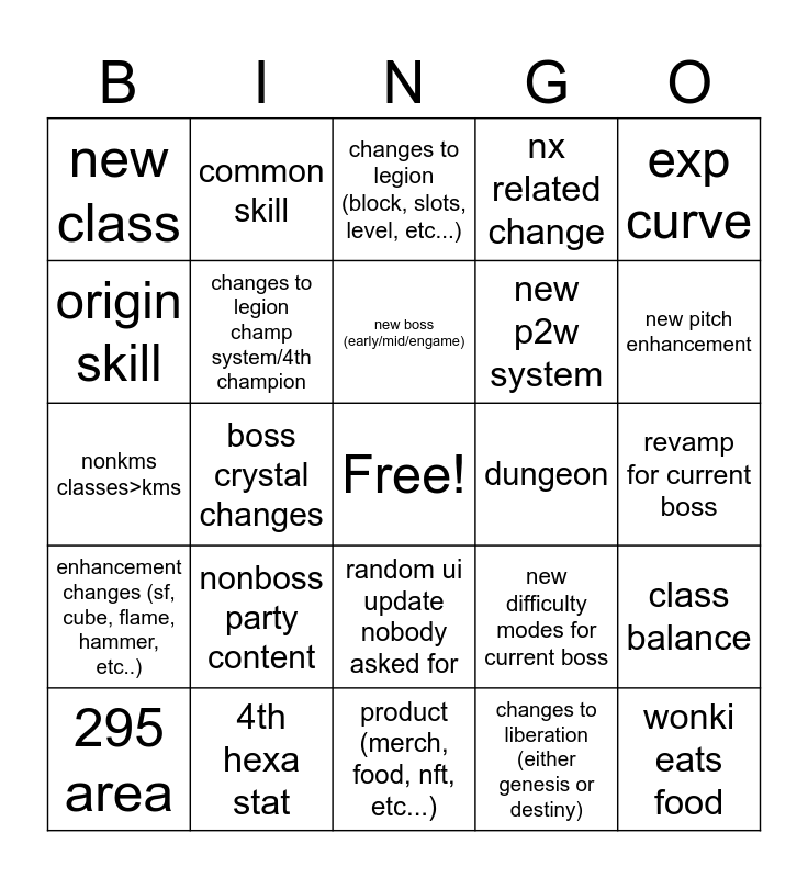 This bingo card has a free space and 24 words: nonboss party content, 4th hexa stat, new boss (early/mid/engame), 295 area, exp curve, new class, origin skill, common skill, dungeon, random ui update nobody asked for, new p2w system, nonkms classes>kms, new difficulty modes for current boss, class balance, changes to legion champ system/4th champion, changes to liberation (either genesis or destiny), revamp for current boss, changes to legion (block, slots, level, etc...), new pitch enhancement, boss crystal changes, wonki eats food, enhancement changes (sf, cube, flame, hammer, etc..), nx related change and product (merch, food, nft, etc...).