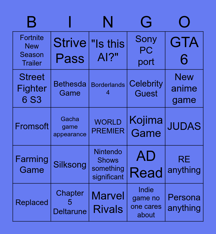This bingo card has a free space and 24 words: Silksong, Chapter 5 Deltarune, Borderlands 4, Replaced, GTA 6, Fortnite New Season Trailer, Street Fighter 6 S3, Strive Pass, Kojima Game, Nintendo Shows something significant, Celebrity Guest, Fromsoft, AD Read, RE anything, Bethesda Game, Indie game no one cares about, JUDAS, "Is this AI?", New anime game, Gacha game appearance, Persona anything, Farming Game, Sony PC port and Marvel Rivals.