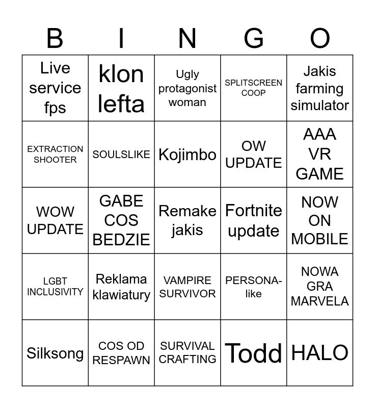 This bingo card has a free space and 24 words: Silksong, Reklama klawiatury, Kojimbo, Todd, Jakis farming simulator, Live service fps, klon lefta, Ugly protagonist woman, Fortnite update, NOW ON MOBILE, WOW UPDATE, SOULSLIKE, PERSONA-like, NOWA GRA MARVELA, EXTRACTION SHOOTER, COS OD RESPAWN, SURVIVAL CRAFTING, SPLITSCREEN COOP, AAA VR GAME, LGBT INCLUSIVITY, GABE COS BEDZIE, VAMPIRE SURVIVOR, OW UPDATE and HALO.